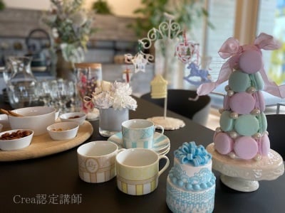 大阪にて2006年どんぐり工房ミニチュア樹脂粘土資格、2007年日本ヴォーグ社ポーセラーツ資格取得を取得しました。その後、夫の転勤で地元岡山県に引っ越し、子どもが小学生に上がったのを機に本格的にお稽古サロンをオープン。この頃クレアと出会い、1日で資格が取れる講座もメニューに加えたことでより多くの方々に通って頂き、『資格の学校ラプティフルール』として講師養成をしています。